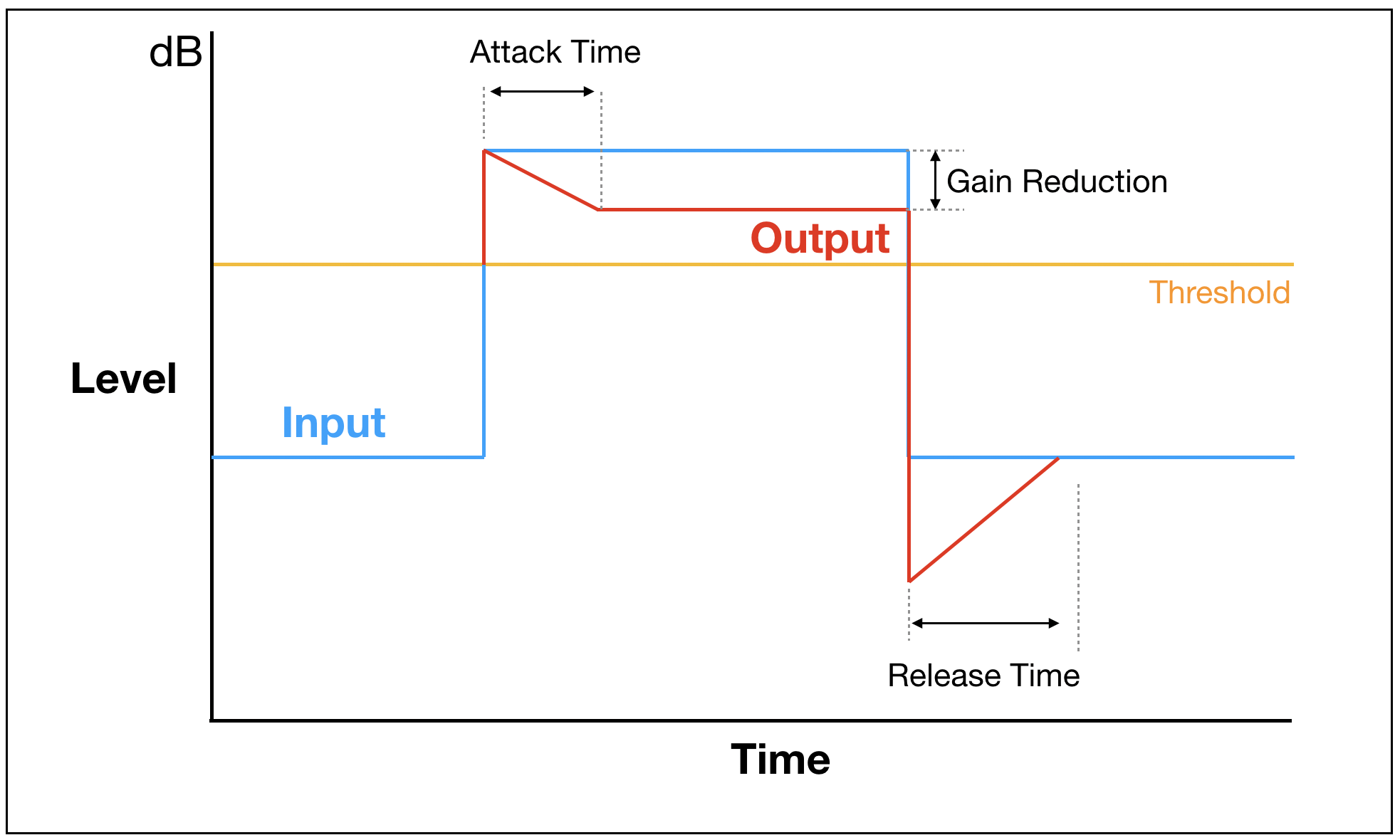위의 그래프는 사실 어택(Attack)과 릴리즈(Release) 타임이 반영되어 있지 않습니다. 보통의 사운드 신호는 깨끗하지 않기 때문에 위와 같이 컴프레서가 적용되면 소리가 갑자기 압축되고 갑자기 풀리기 때문에 매우 어색한 사운드가 나오게 됩니다. 따라서 적절한 어택 타임과 리리즈 타임을 설정하여 컴프레서가 자연스럽게 걸리게 하는 것이 핵심입니다.