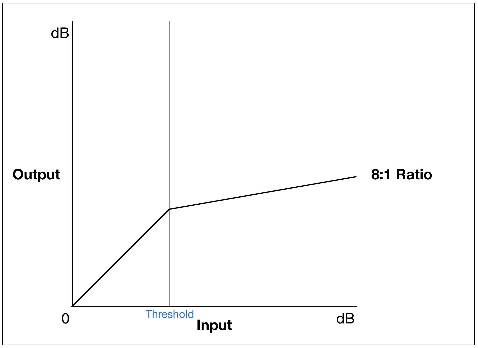 8:1의 레이시오를 주면 Threshold를 넘는 모든 인풋 신호를 1/8로 압축하게 됩니다. 그래프로 보면 다음과 같습니다.