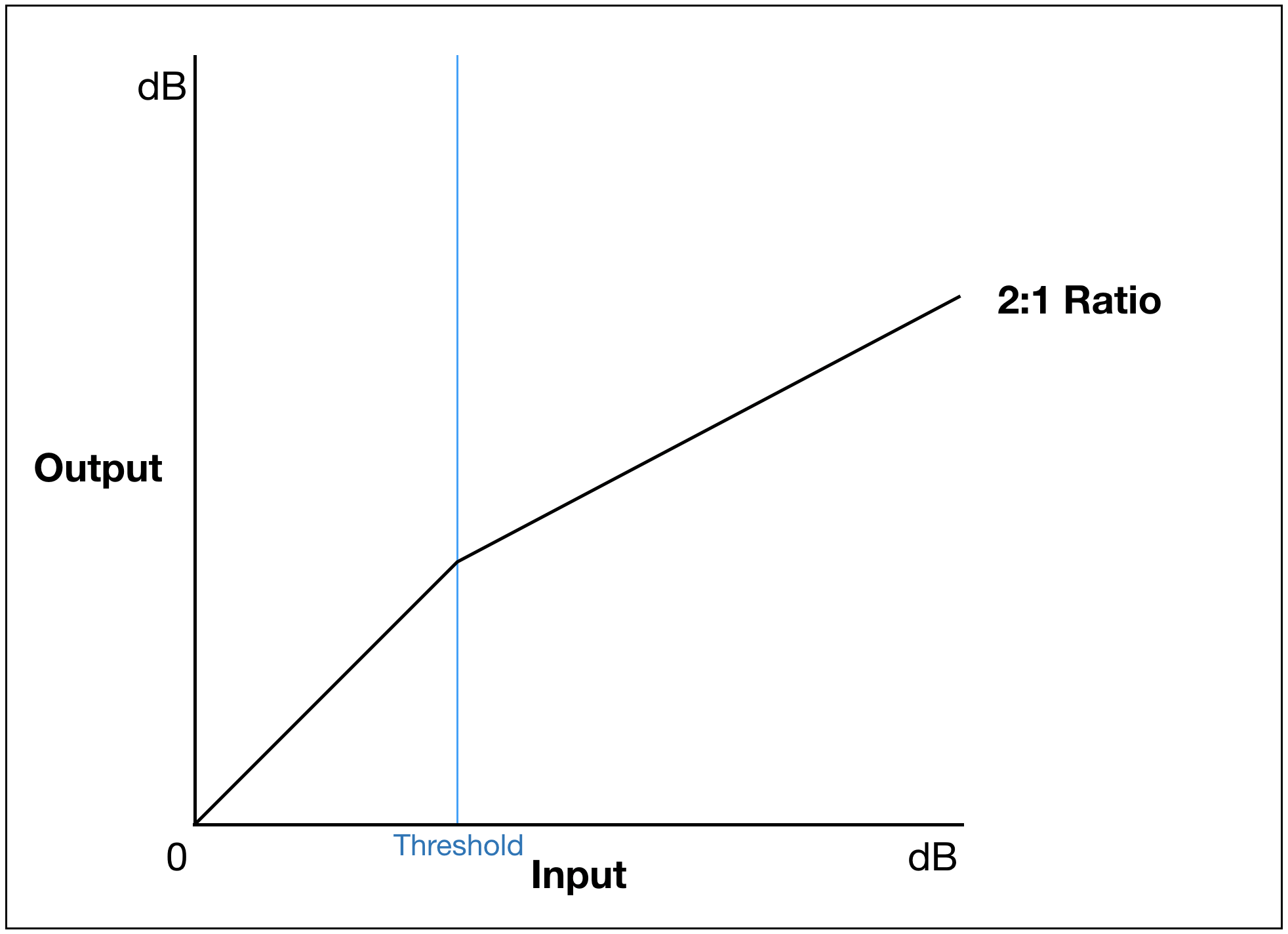 압축하는 비율을 결정합니다. '볼륨을 어느정도 줄이고 싶다'로 보면 가장 편안합니다. 보통의 컴프레서라면 2:1 에서 8:1 정도의 범위를 가지고 있습니다. 2:1의 레이시오도 인풋을 반으로 줄여벌이기 때문에 매우 큰 값입니다. 레이시오를 2:1로 주었을때의 그래프는 다음과 같습니다.