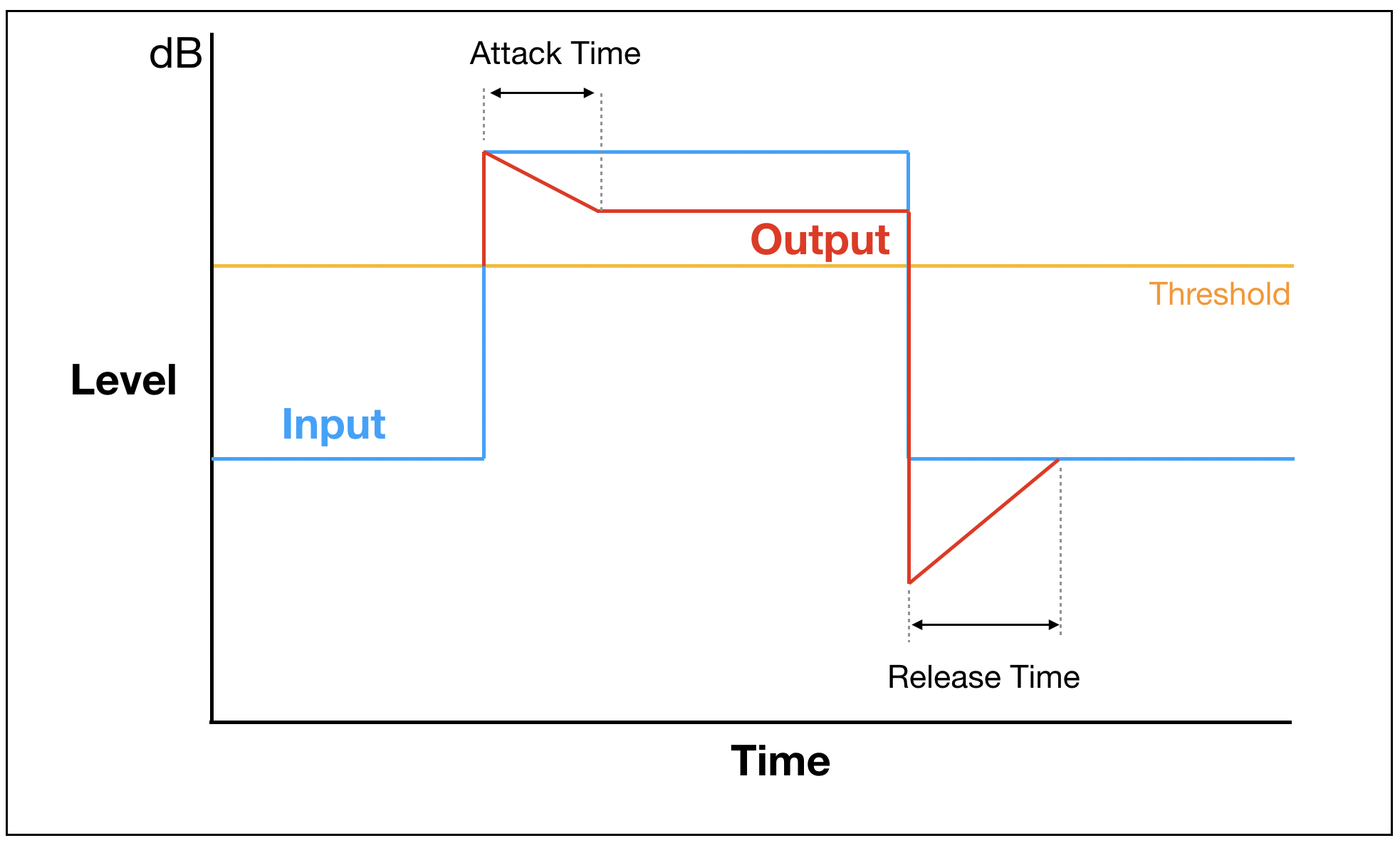 위의 그래프는 사실 어택(Attack)과 릴리즈(Release) 타임이 반영되어 있지 않습니다. 보통의 사운드 신호는 깨끗하지 않기 때문에 위와 같이 컴프레서가 적용되면 소리가 갑자기 압축되고 갑자기 풀리기 때문에 매우 어색한 사운드가 나오게 됩니다. 따라서 적절한 어택 타임과 리리즈 타임을 설정하여 컴프레서가 자연스럽게 걸리게 하는 것이 핵심입니다.