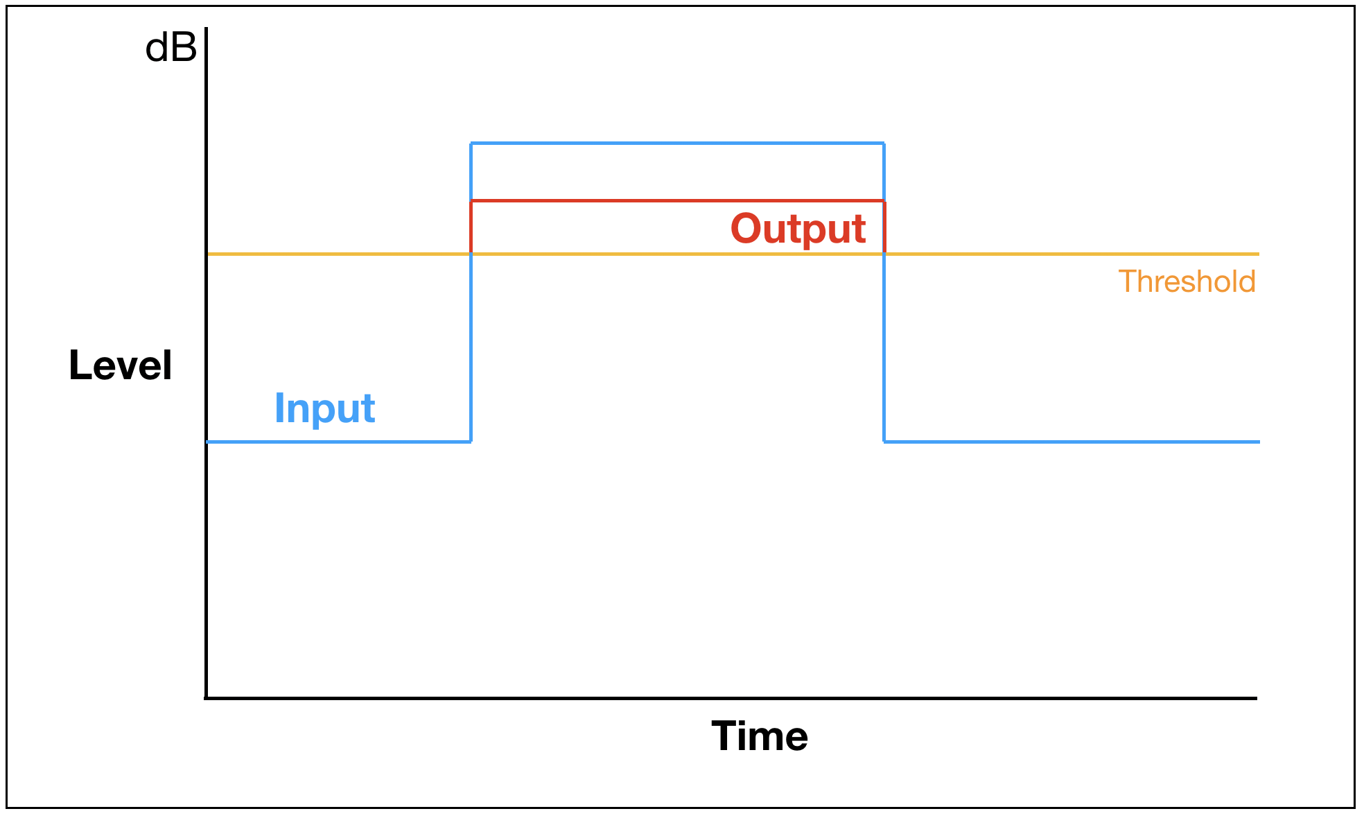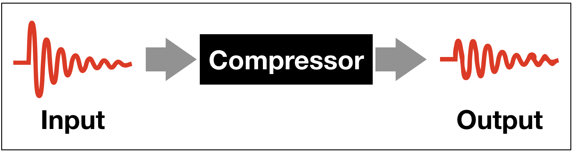 컴프레서는 다음과 같이 다이나믹 레인지 (Dynamic Range)가 큰 인풋 신호 (Input Signal)을 보다 평탄한 아웃풋 신호 (Output Signal)로 만들어주는 역할을 합니다.