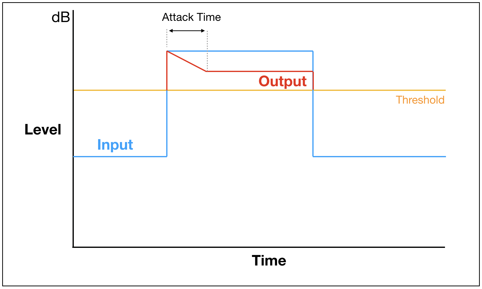 착각하지 말아야할 부분은, 어택타임 이후부터 컴프레서가 걸리는 것이 아니라, 처음부터 컴프레서는 압축을 시작하는데 어택타임이 끝나는 시점에서 완전히 걸린다는 점입니다. 이를 그래프로 표현하면 다음과 같습니다.