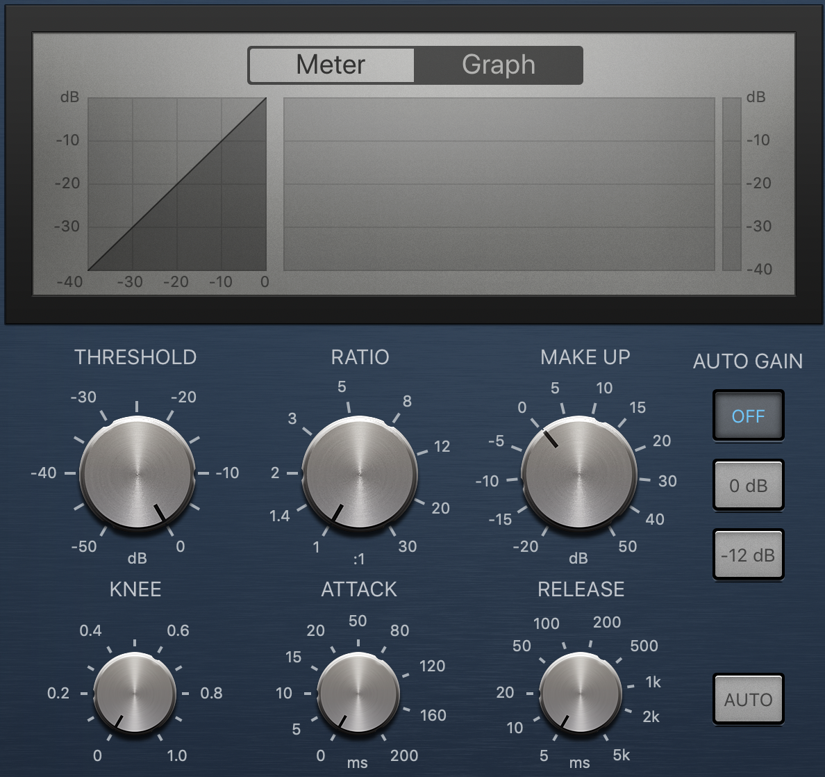 우선은 신호가 그대로 통과해서 컴프레서가 걸리지 않도록, Threshold 값은 0, Ratio는 1:1 (또는 off, 혹은 가장 낮은 값으로), Knee 값도 off로 합니다. 컴프레서가 걸리거나 걸리지 않은 효과를 즉각적으로 들을 수 있도록 일단 어택(Attack)과 릴리즈(Release)는 가장 빠르게 설정해둡니다.