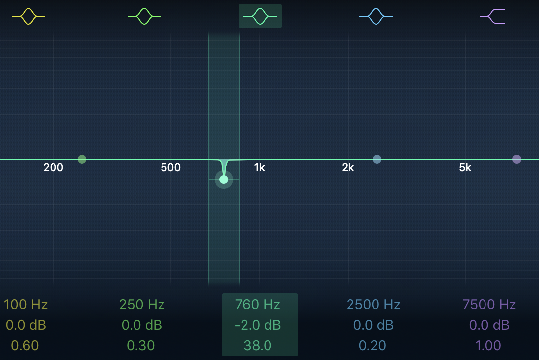 컴프레서로 전체 하모닉스를 추가한 후에 들어보면 문제가 되는 주파수가 발견될 때가 있습니다. EQ게인을 높이고 좌우로 스위핑하면서 문제가 되는 주파수를 찾아내어 살짝 깎아내 주는 것(Notch)이 포인트입니다. 최대 -2dB정도만 깎아내주는 식으로 작업합니다. -2dB이상으로 깎아야할 문제라면 사실 믹싱 자체에 문제가 있는 경우가 많습니다.