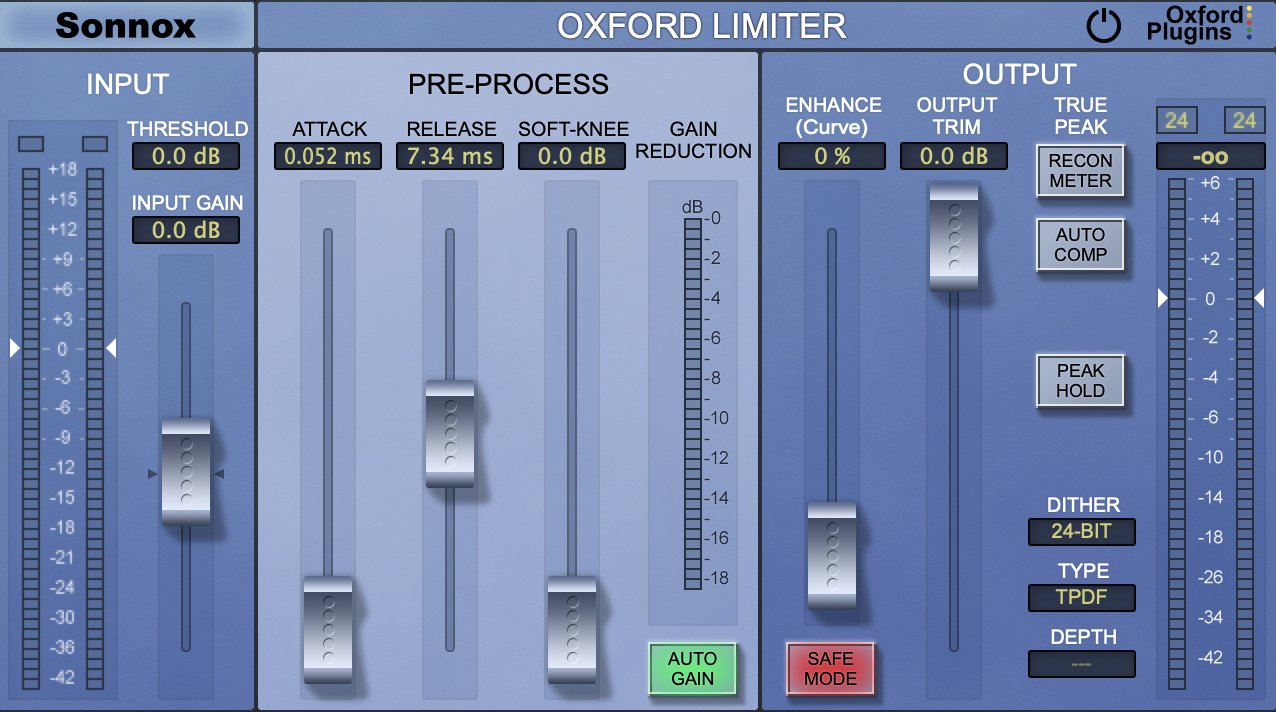 단순히 데모를 위해 음압을 올리는 것이 목적이므로 투명한 계열의 리미터를 사용하고, 전체 음이 찌그러지지 않는 선에서 최대한 음압을 올려주는 것이 좋습니다. 제 경우 Sonnox의 Oxford Limiter를 최근 가장 많이 사용하고 있네요.