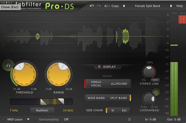 FabFilter의 Pro-DS 디에서로 기본 기능을 살펴보면 다음과 같습니다.