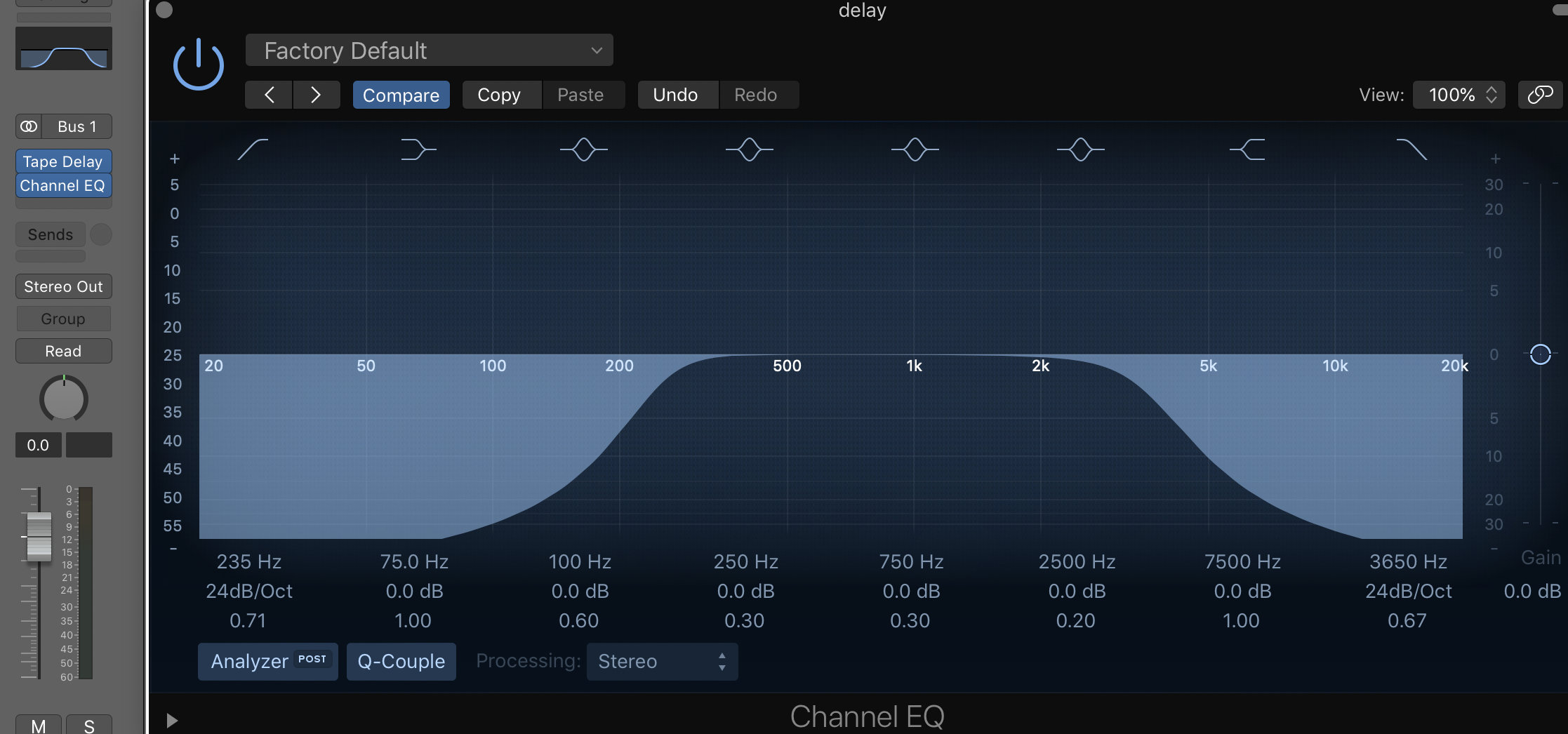 우리가 HPF를 트랙에 적용할 때에는 드럼의 킥이나 베이스의 공간을 확보하기 위해서 다른 트랙들에 걸어주는 경우가 많은데, 이펙트를 줄 때에도 똑같은 상황을 생각하면 됩니다. 또한, 반사되어 반복적으로 들리게된 사운드의 저역은 믹스 전체에 우중충함을 가져오기 때문에 상당히 과감하게 HPF를 적용할 수 있습니다. 적게는 100Hz 부터 많게는 600Hz 까지도 적용하여 믹스에 끼치는 악영향을 최소화 해주면 됩니다.