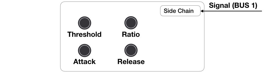 컴프레서 플러그인 마다 사이드체인(Side Chain)기능이 있는 컴프레서가 있고, 없는 컴프레서가 있습니다. 사이드체인이 있는 컴프레서를 베이스 채널에 올리고, BUS 1의 입력신호를 받도록 사이드체인을 설정하면 됩니다.
