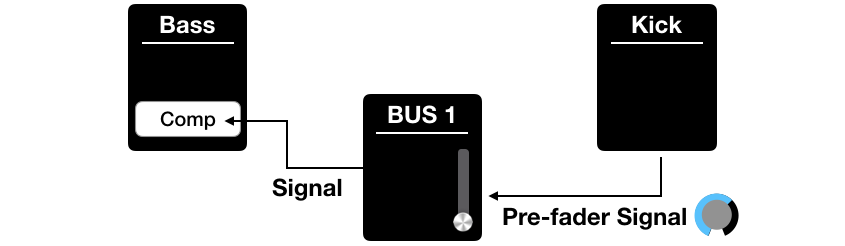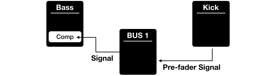 믹싱 상에서 킥이 뮤트되어도 베이스의 사이드체인 컴프레션을 통한 효과를 유지하기 위함이고, 킥의 볼륨 변화에 따른 직접적인 영향을 사이드체인에 미치지 않기 위함입니다.