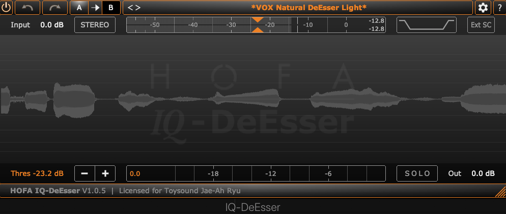 치찰음을 잡기 위해 디에서(De-Esser)를 거는데, 제 경우 HOFA의 IQ-DeEsser를 좋아하는 편입니다. 디에서를 통해 과도한 's'을 제거하는데 자연스러움을 해치지 않아야 합니다. IQ-DeEsser가 제가 듣기에는 가장 자연스러웠습니다. 사실 디에서마다 살짝 용도가 달라서 3~4개의 디에서 플러그인을 보유하고 있는 것이 가장 편합니다. 보컬의 발음이나 발성의 특성을 고려해 서로다른 디에서를 적용할 필요가 있기 때문입니다.