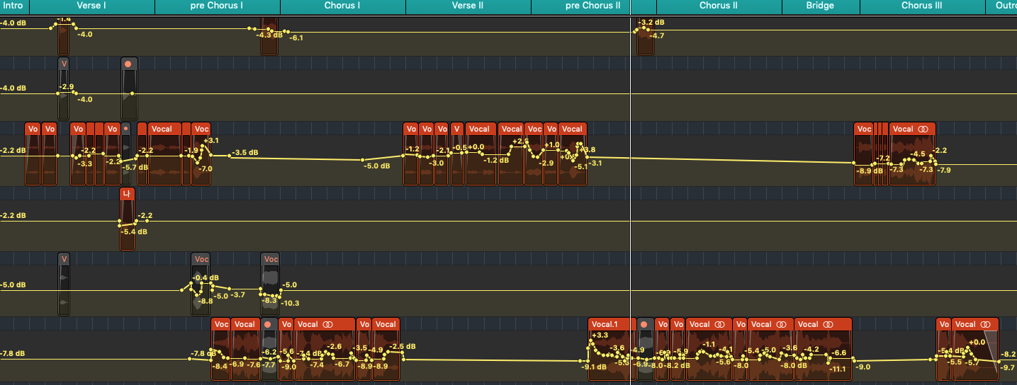 보컬트랙은 박튠과정 후 트랙에 따라 분류 후 각기 볼륨 오토메이션(Volume Automation)을 주어 1차적으로 정리하였고, 그룹화하여 필요한 플러그인을 적용하였습니다.