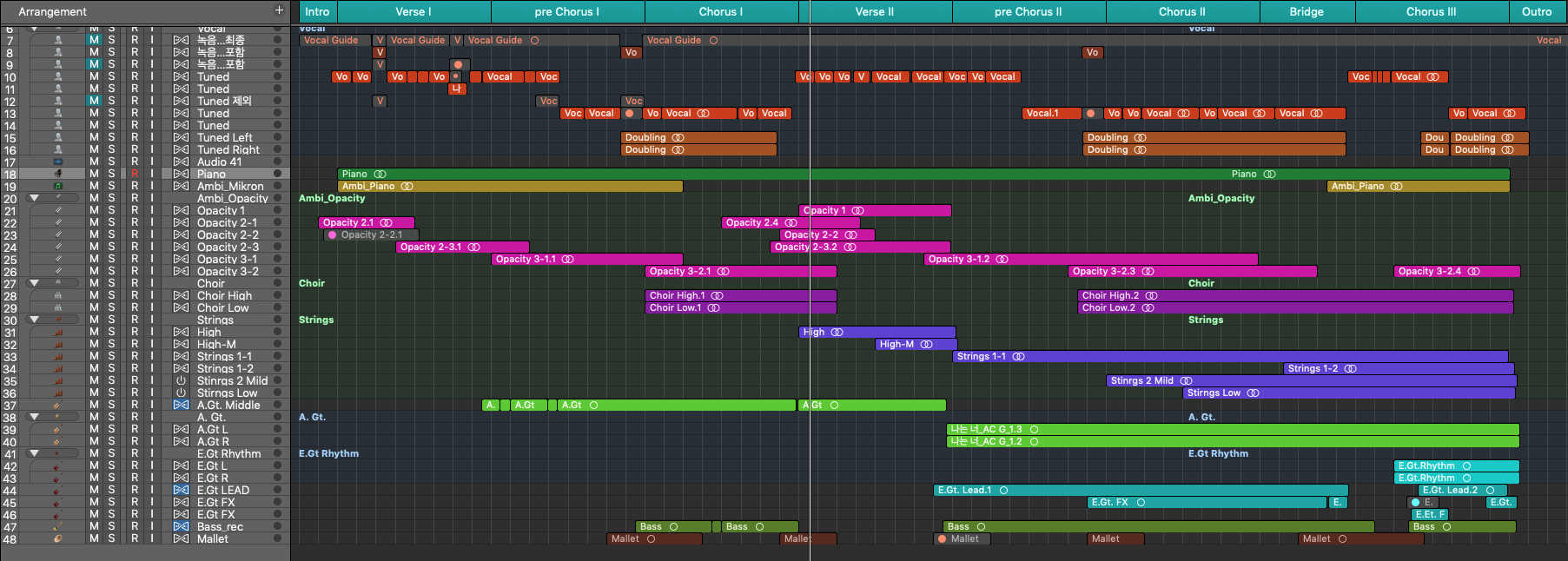 믹싱은 ITB (In The Box)로 수행하였으며, DAW는 Logic Pro X입니다. 전체 48트랙이 최종적으로 사용되었으나, 보정 후 뽑아서 삭제한 트랙까지 산정하면 6~70트랙 정도 됩니다. 모든 과정을 설명하기에는 방대하여 가장 중요한 보컬트랙을 위주로 작업기를 적을까 합니다.