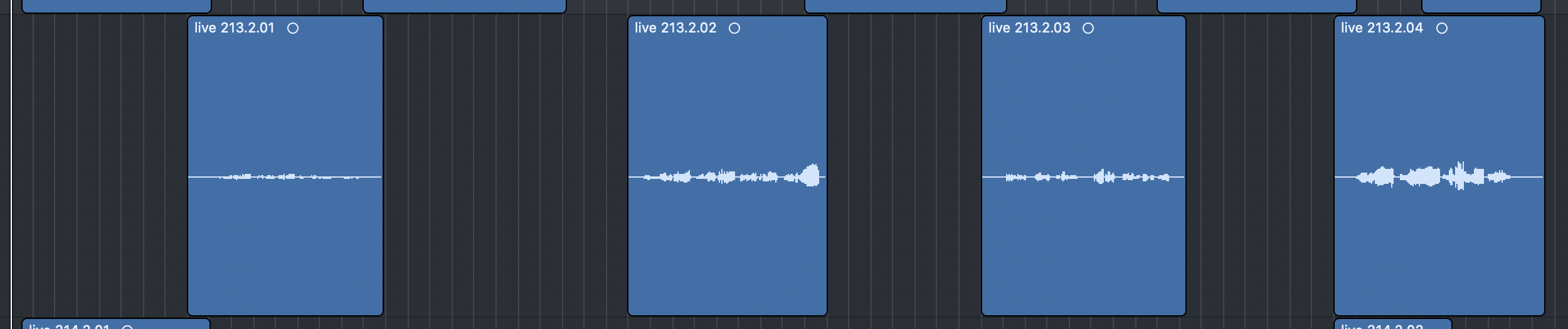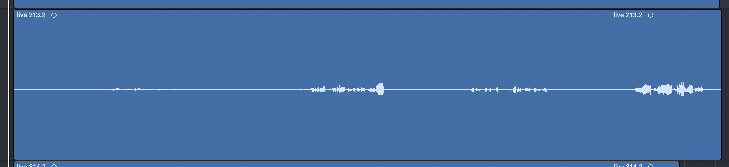 녹음이 띄엄띄엄 일어났을 경우, 이처럼 빈 공간이 존재하게 됩니다. 이 빈공간은 시각적으로는 아무 소리도 나지 않는 것처럼 보일 수 있으나, 실상 녹음 공간의 미세한 노이즈들이 들어있을 확률이 높습니다. 믹싱을 하면서 트랙이 쌓이다보면 이런 미세한 노이즈들이 겹쳐서 예상치 못한 잡음을 낼 때가 있고, 뒤늦게 처리해야할 때가 많습니다. 따라서, 오디오파일을 받으면 우선적으로 조용한 부분을 제거해주는 것이 여러모로 유리할 때가 많습니다.