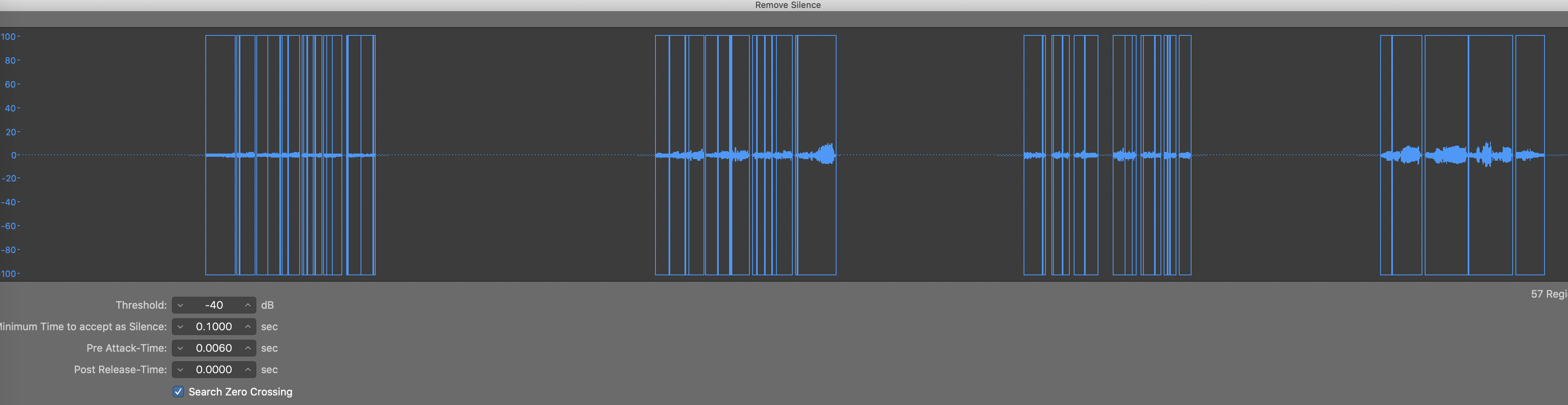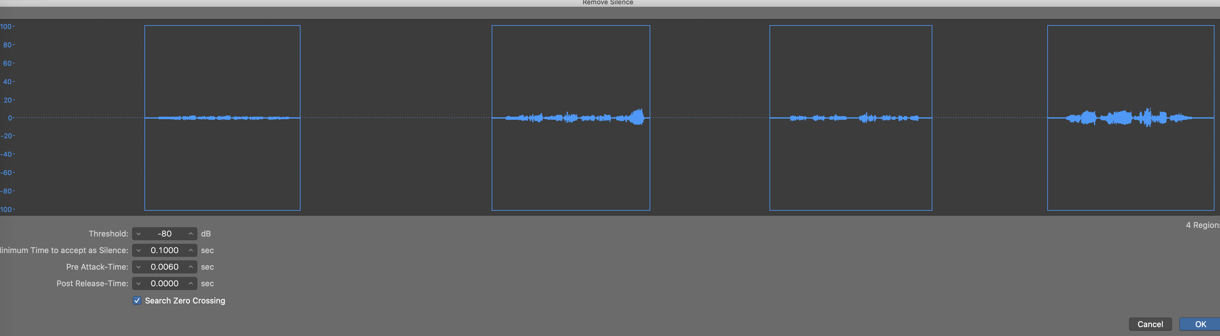 해당 오디오 파일을 선택한 상태에서 단축키로 Remove Silence를 불러오면 다음과 같은 창이 뜹니다.