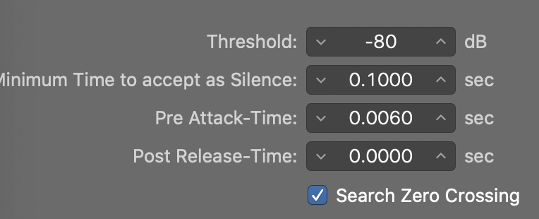 우리는 드럼트랙처럼 각각의 트랜션트(Transient)를 대체하는 것이 목적이 아니라, 오디오가 있는 부분을 살리고, 미세한 노이즈나 묵음 등을 제거하기 위함이므로 스레숄드(Threshold)를 가장 낮게 설정합니다. 특히, 보컬 트랙의 경우 보컬의 작은 호흡이나 숨쉬는 소리가 음악적으로 필요할 때가 있는데, 자칫 스레숄드를 과도하게 설정하면 날라가버릴 수도 있습니다. (물론 오디오 파일을 늘려 언제든지 복구가 가능하지만)
