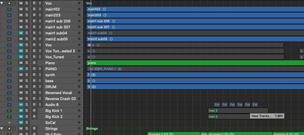 로직 창의 디폴트 상태는 전체뷰를 제공하기에 다음과 같이 트랙의 상하 공간이 작습니다. (현재 믹싱 중인 '스트레이 - 그냥 있쟎어'를 가지고 와봤습니다 😄)