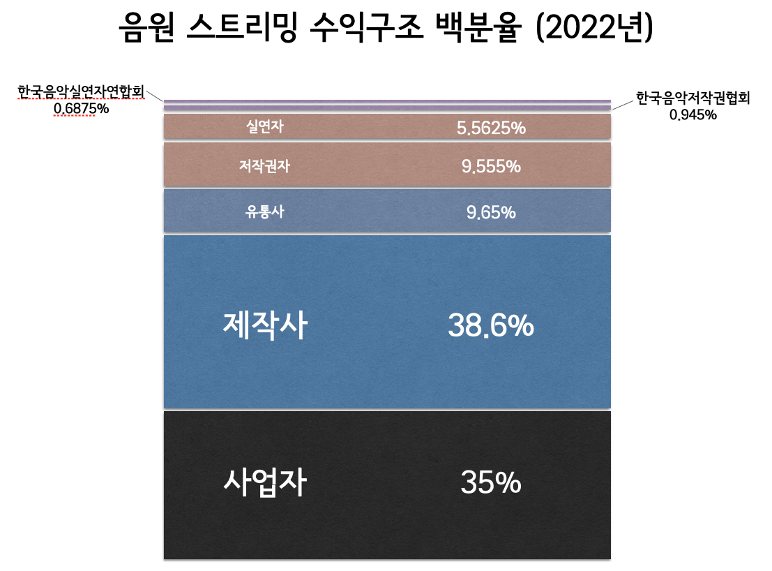 전체 음원 스트리밍 수익구조를 백분율로 표시해보면 다음과 같습니다.