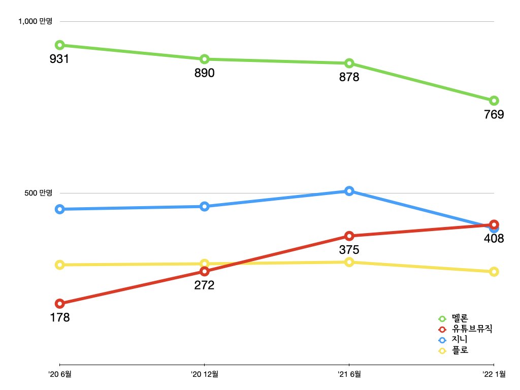 2020년 6월 931만명에 달하던 멜론 이용자수는 22년 1월 769만명으로 급감한 가운데, 유튜브 뮤직은 178만에서 408만명으로 급상승 했습니다. 심지어 최근에는, 지니마저 앞질러 버렸습니다.